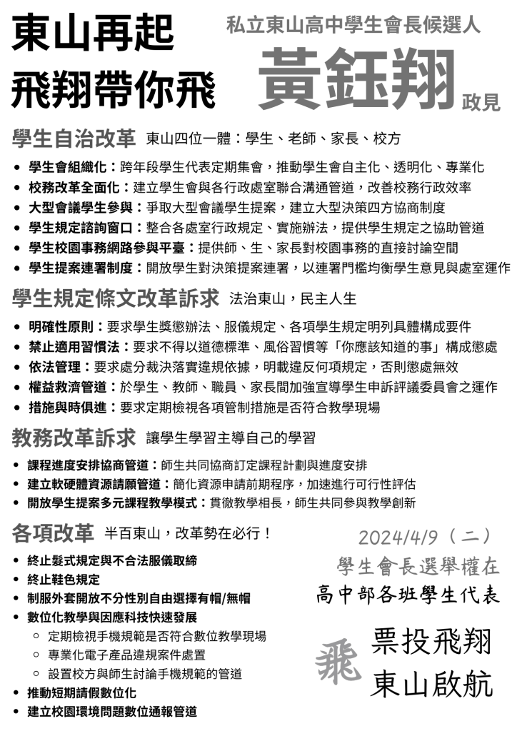 - 校務改革全面化:建立學生會與各行政處室聯合溝通管道,改善校務行政效率