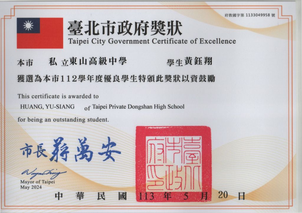 十年後,2024年,我用全校選舉再次得到臺北市市級優良學生的肯定。這是經過班內選舉、處室師長投票、各班選舉得出來的。選舉傳單之前也有發過一篇文,也感謝我重病時幫我發傳單的朋友們🙏總之,雙北兩任市長的獎都有了~