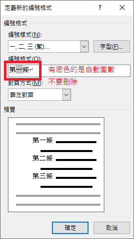 選定編號變數的樣式,在編號格式新增固定的文字,輸入框自動產生的底色文字代表變數,不要刪除。
