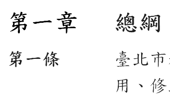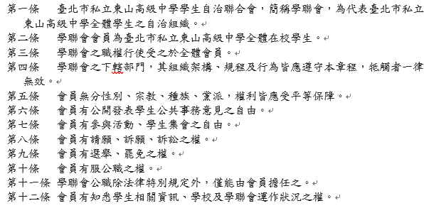 今天我們以《臺北市私立東山高級中學學生自治聯合會組織章程》作為舉例,我們有50條條文,其中分了六章。根據我們的法規標準法有規定,法律條文的標號格式有一定限制。