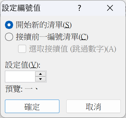 編號可能沒有從頭開始,可選擇「從一開始」或「設定編號值」自訂。