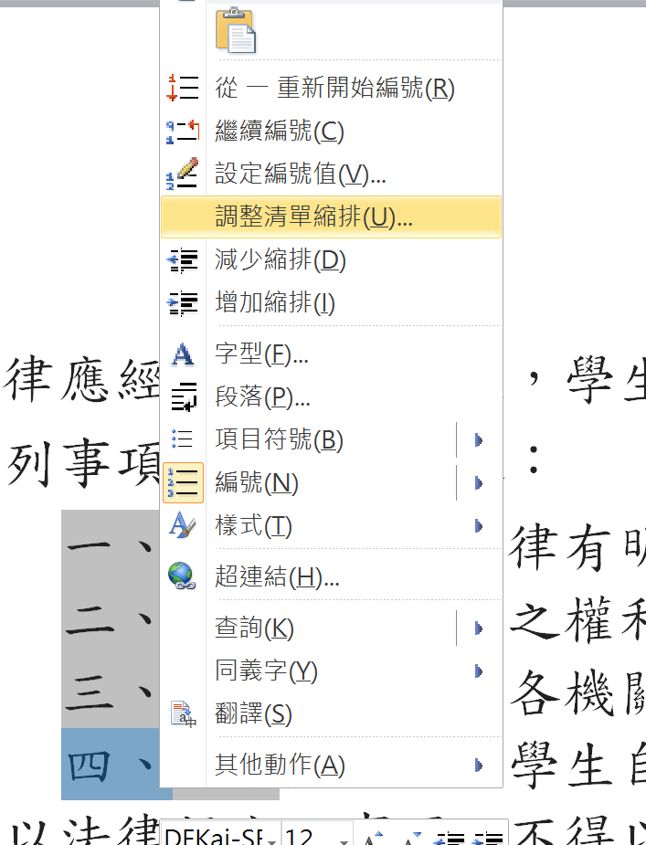 設定標號格式後,調整跨多行的項目對齊。先斷行(變兩項),然後在多餘的項數前按Backspace去除標號,再按Tab對齊。