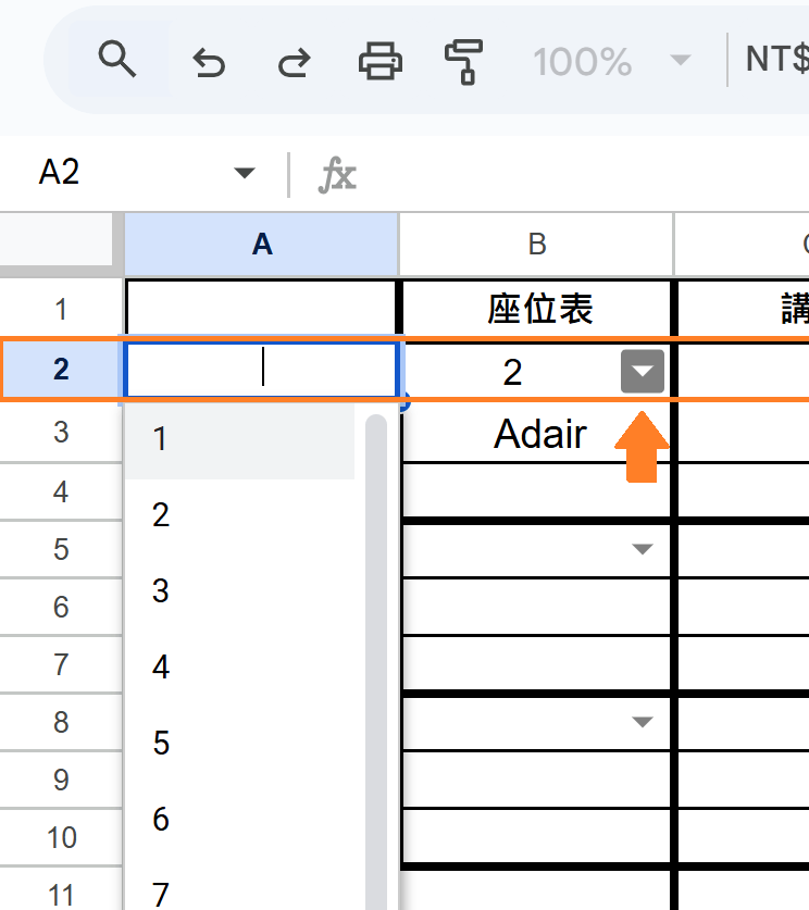 回到座位表分頁,輸入座號在上半表每一格座位的最上格,座號輸入格旁邊會有個小箭頭,點開可以拉開下拉選單
